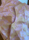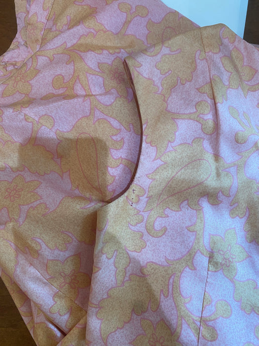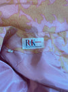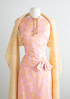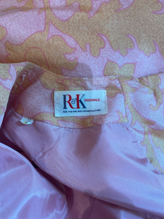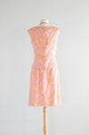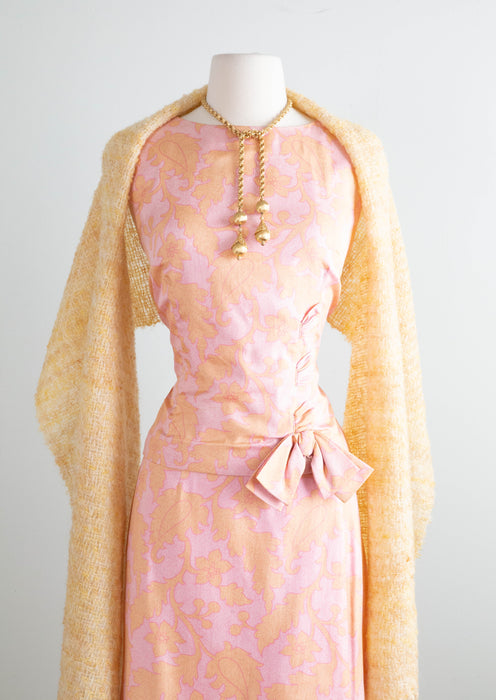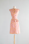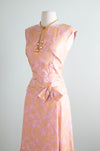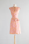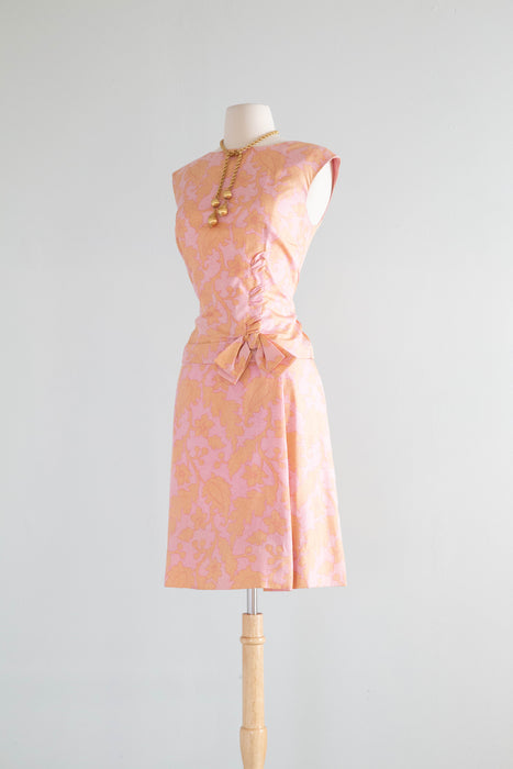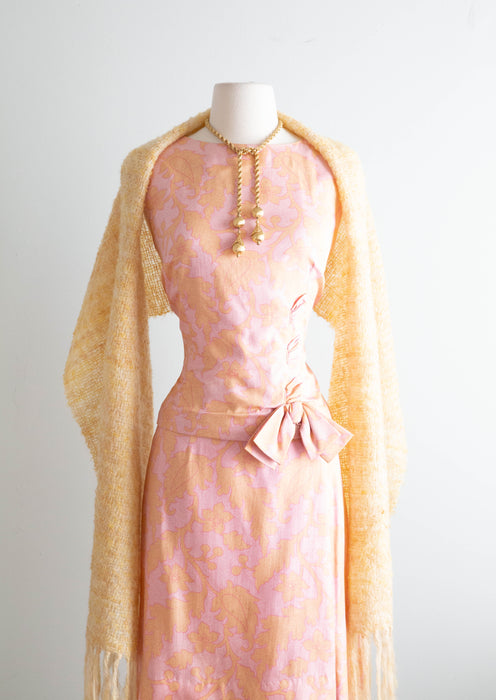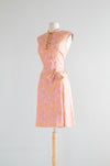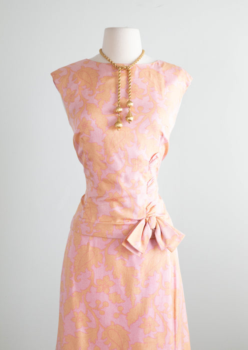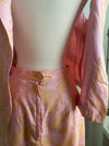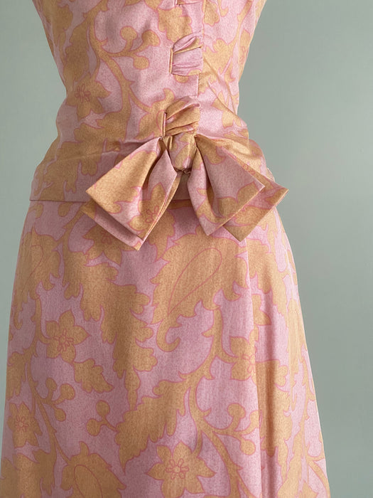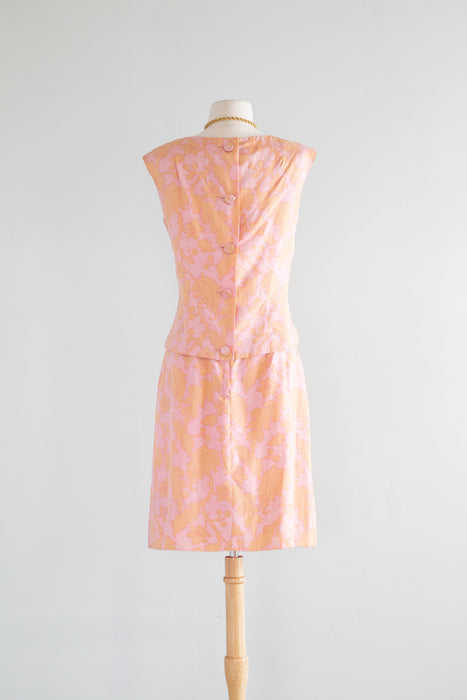 Fabulous 1960's pink grapefruit and apricot silk two piece set by R&K. Featuring a semi- fitted top with beautiful woven sash and bow detail and self covered buttons up the back. The matching skirt is knee length and zips up the back and features a kick pleat on the side. Fully lined interior. In overall excellent condition, freshly cleaned and ready to wear.