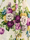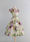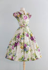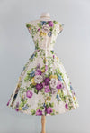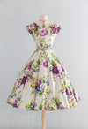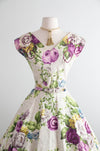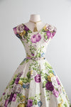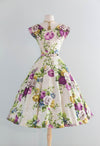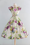 In 1947 textile manufacturer Saison came out with their "Happily Married" fabric line in a variety of patterns and textures. This gorgeous early 50's party dress is made of such fabric and features a gorgeous purple and yellow rose print. The dress features a v neckline, short sleeves, a fitted waist, and full skirt. The skirt is lined with a layer of cotton muslin. Zips up the side with original metal zipper. In excellent condition, freshly dry cleaned and ready to wear.