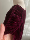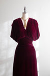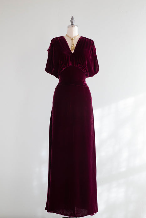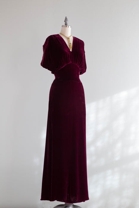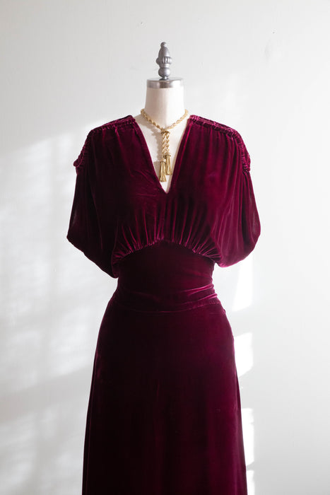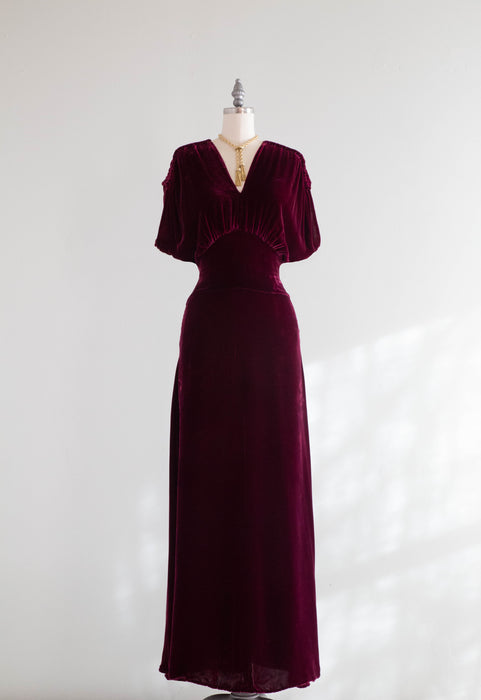 Absolutely stunning late 1930's silk velvet evening gown in the richest shade of deep fuchsia. Featuring a elegant silhouette with plunging neckline, fitted waist and dramatic gathered shoulders. Snaps up the side for easy getting on and off. A little fuller in the back for ease of movement. Just the prettiest thing ever! In overall excellent condition, freshly cleaned and ready to wear.
