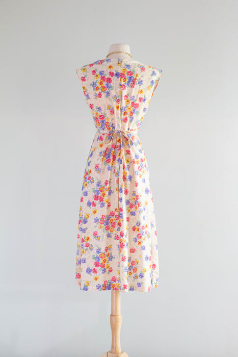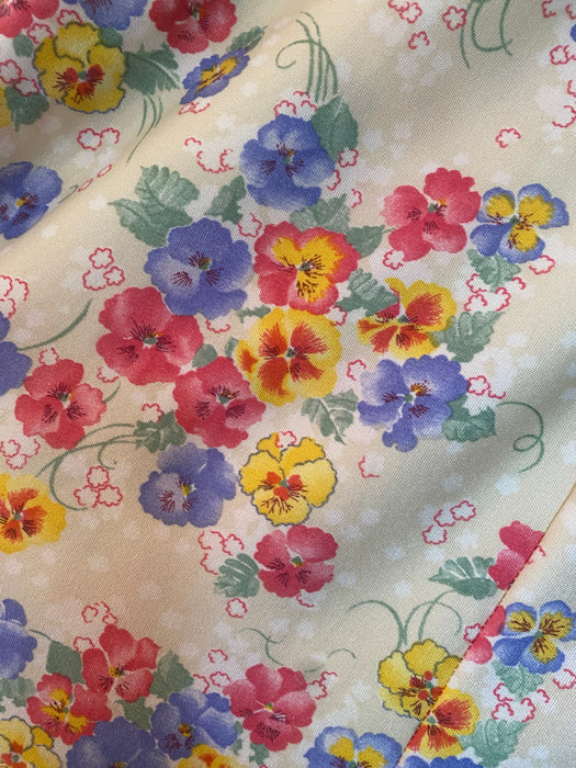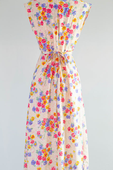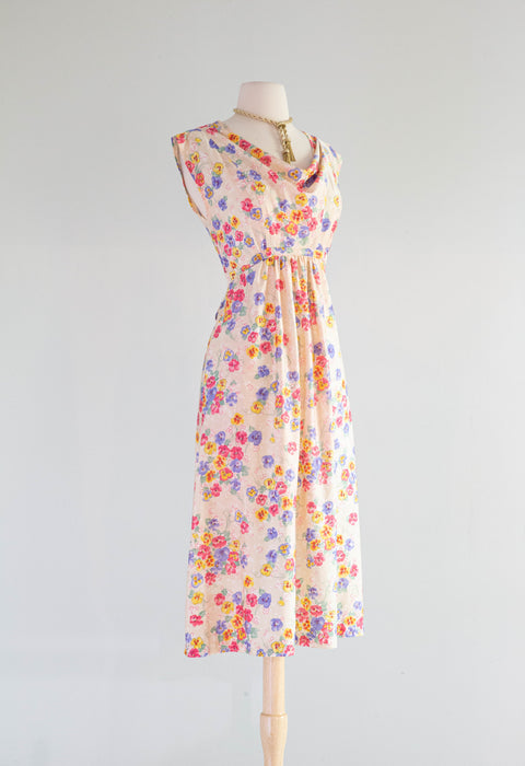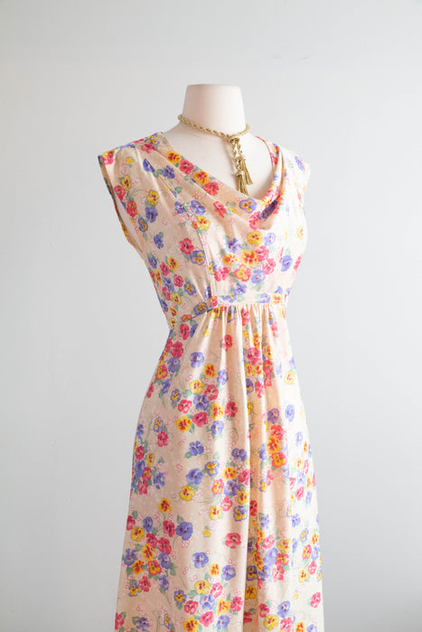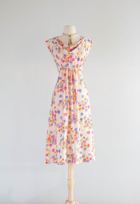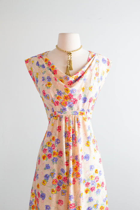 Pretty 1970's Pansy Print Cowl Neck Spring Dress / Medium