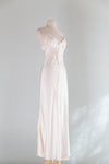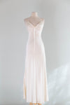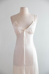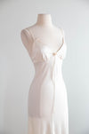 Exquisite vintage ivory silk slip dress featuring a flattering bias cut that drapes elegantly on the body. Delicate pearl embellishments adorn the bust, with a charming rosette detail at center front. The slip-on silhouette makes dressing effortless. Perfect as a bridal nightgown or standalone slip dress for those seeking timeless sophistication and refined vintage appeal. In overall excellent condition, freshly cleaned and ready to wear.