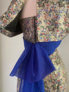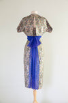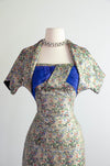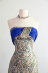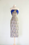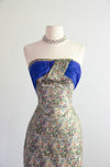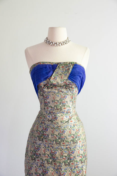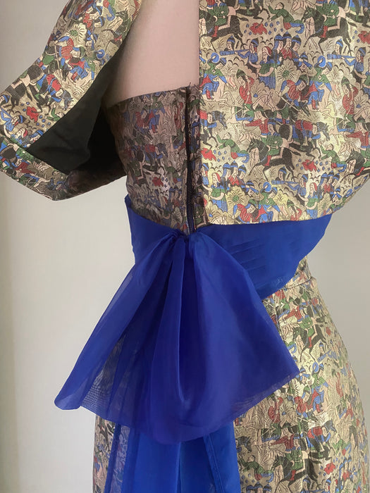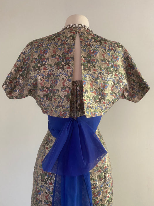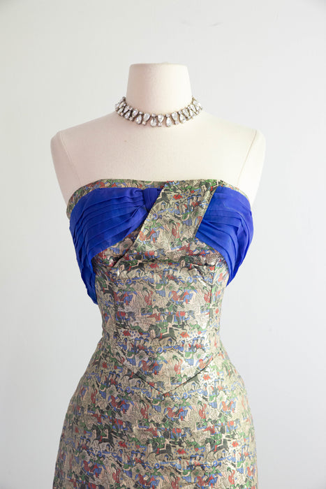 The epitome of Hollywood glamour! This rare couture cocktail dress and jacket set comes from the exclusive Maxwell Shieff boutique in Beverly Hills. Known for carrying rare and expensive designer clothing in the 50's and 60's. This set is crafted from truly incredible silk metallic lame brocade and features horses, warriors and musical instruments. Quite possibly inspired by the Bayeux Tapestry. Featuring a strapless bodice with interior boning, a dramatic royal blue sash that forms a bow in the back and matching bolero jacket thats open in the back. Absolutely beautifully constructed with hand finishes. Zips up the back with original metal zipper and fully lined. In excellent condition, freshly dry cleaned and ready to wear.