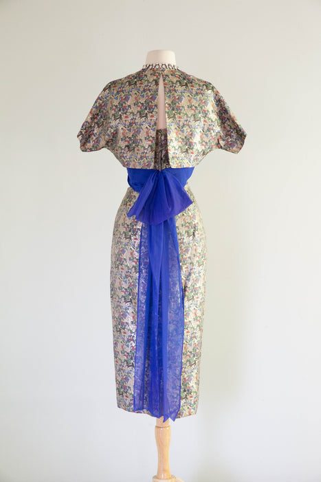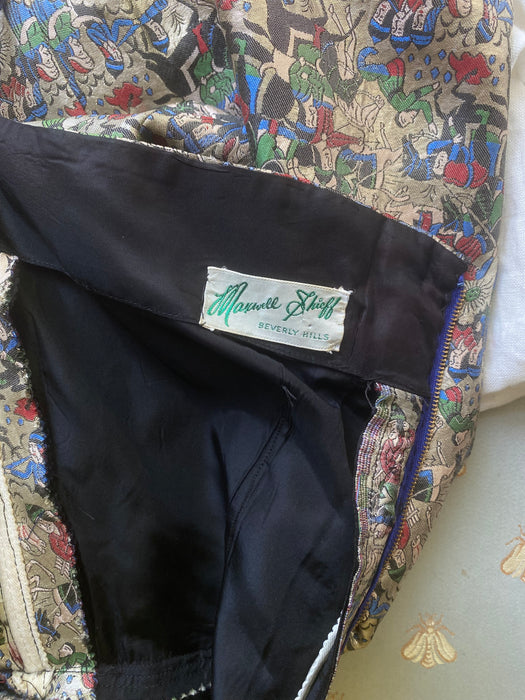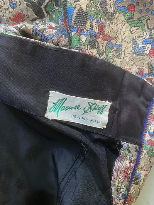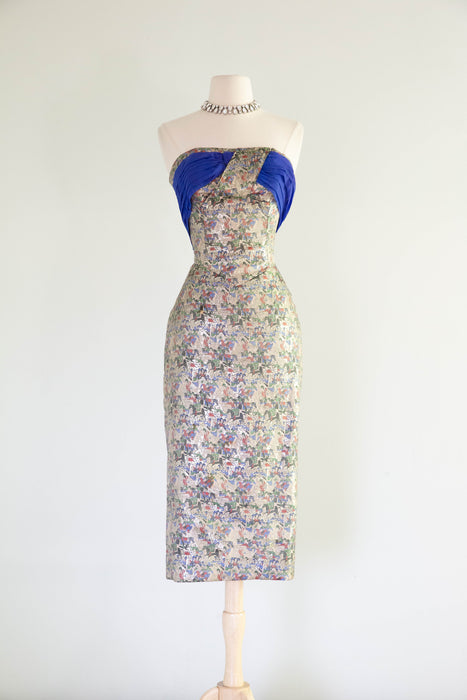 Fabulous 1950's Couture Cocktail Dress From Maxwell Shieff In Silk Brocade Novelty Print / SM