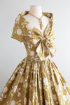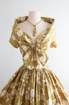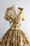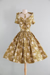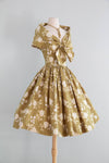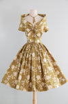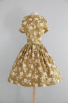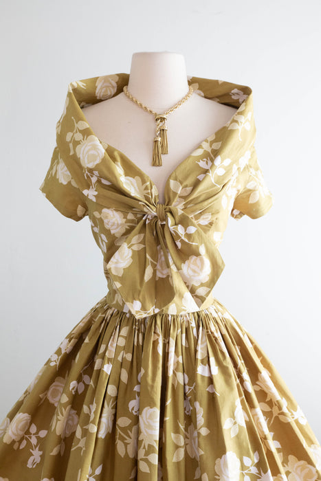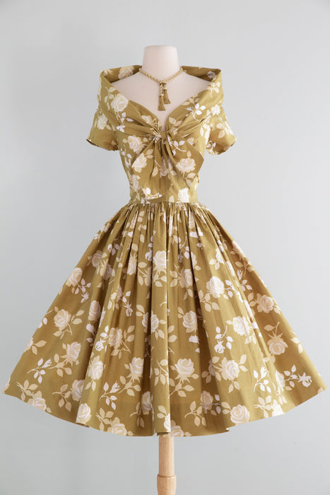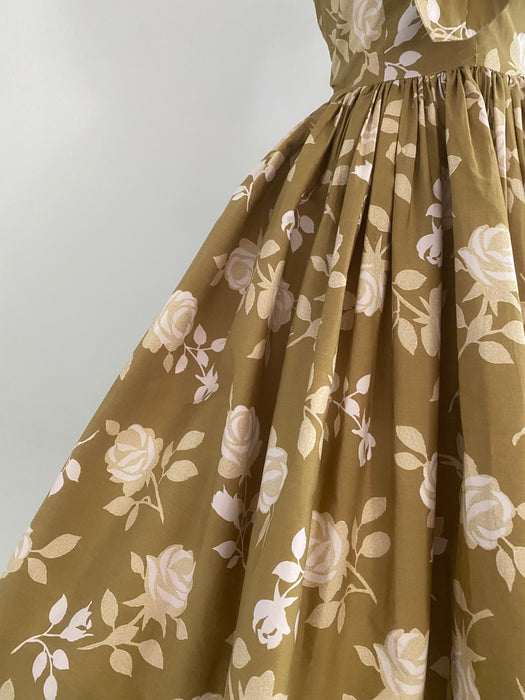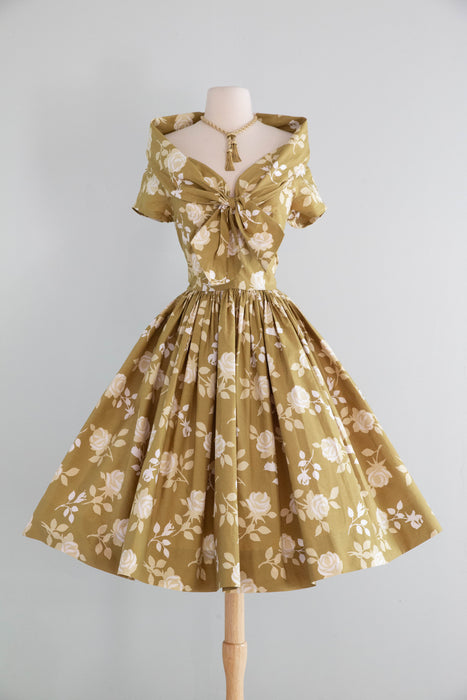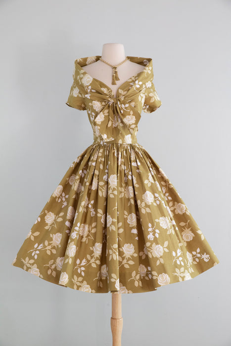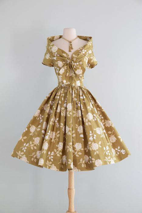 Absolutely fabulous 1950's crisp cotton rose print dress by legendary British dress maker Horrockses. This iconic dress features a stunning stand up shawl collar and tie front. Short sleeves and fitted waist above a full gathered skirt. The color is more green in real life, like a granny smith apple or olive. Zips up the back with original metal zipper. In excellent condition, freshly dry cleaned and ready to wear.