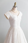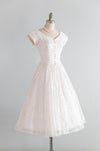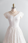 This exquisite 1950s courthouse wedding dress by Lori Dawson epitomizes vintage charm and elegance. Crafted in ivory lace, it features a fitted bodice with a flattering V-neckline and delicate cap sleeves, adorned with decorative buttons that add refined detail. The voluminous full skirt creates that quintessential mid-century silhouette, while the fully lined slipper satin interior ensures comfort and structure. A functional side zipper with original metal hardware completes this authentic piece. Perfect for the bride seeking understated sophistication and timeless style, this petite-sized dress captures the essence of classic 1950s bridal design. In excellent condition, freshly cleaned and ready to wear.