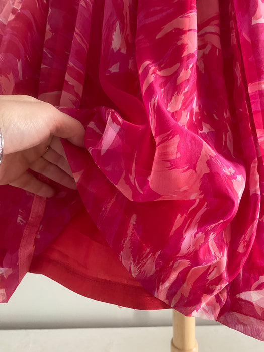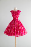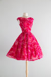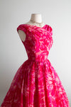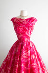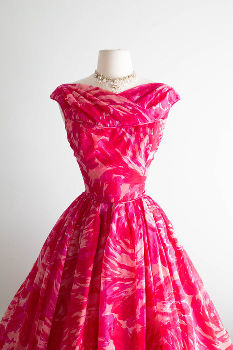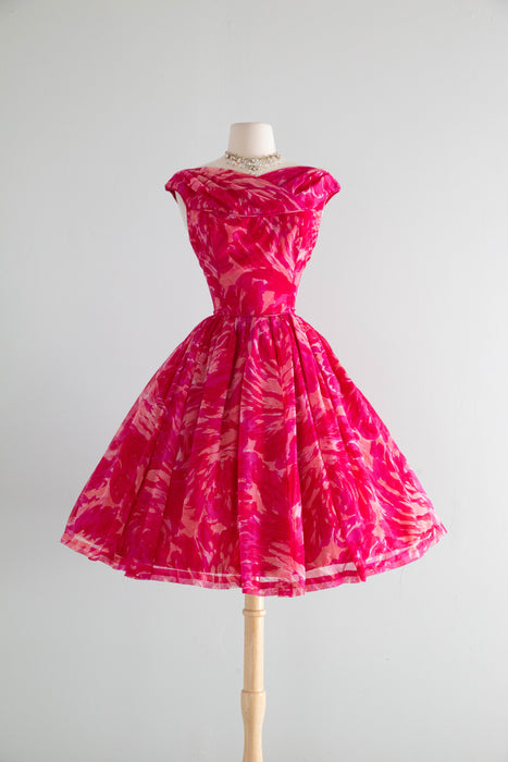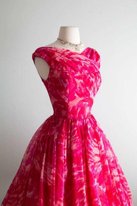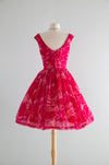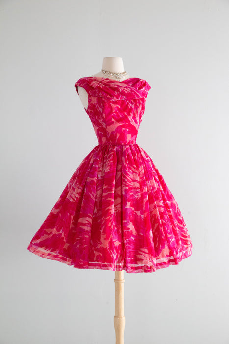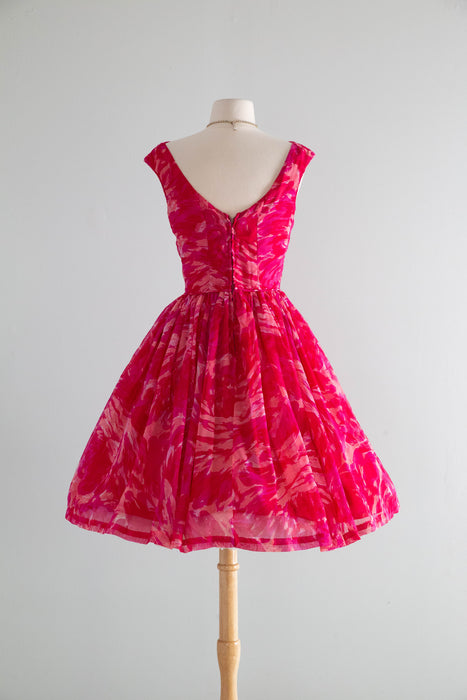 Stunning Early 1960's Shocking Pink Painterly Floral Chiffon Party Dress / S