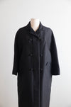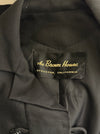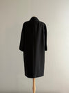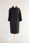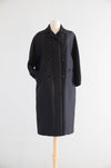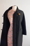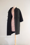 Elegant 1960s black with a hint of gold shantung silk evening coat by Stanley Nelson, California. Inspired and similar to coats made by Balenciaga and Dior at the time. Features a chic cocoon silhouette, double-breasted front with beaded buttons, and bracelet-length sleeves. Convenient pockets at the sides. Luxuriously lined in taffeta—an exquisite example of midcentury sophistication, perfect over a cocktail or evening dress.