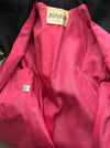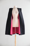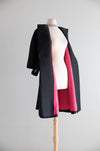 This striking 1960’s silk evening coat is a dramatic homage to the sculptural elegance pioneered by Cristóbal Balenciaga. Cut in an exaggerated aline silhouette, the coat showcases the era’s fascination with architectural volume and controlled minimalism. The outer shell is crafted from luminous silk & wool shantung with a subtle sheen, allowing the clean lines and generous proportions to speak with quiet authority. Opening the coat reveals a bold hot pink silk lining—an unexpected, fashion-forward contrast that delivers a vivid flash of color with movement. Hidden pockets at the sides and bold saucer buttons at the front.