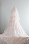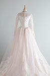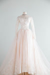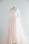 From the estate of the original owner comes this truly extraordinary wedding gown. Purchased in 1953 at the iconic Priscilla of Boston this pale blush pink wedding gown boasts a divine illusion neckline and long sweeping train. Made of gleaming pink slipper satin under a layer of fine ivory netting and Chantilly lace, with long sheer sleeves and covered buttons up the back. Plenty of interior seam allowance for alterations. Comes complete with original matching veil. In excellent condition, freshly dry cleaned and ready to wear.