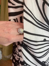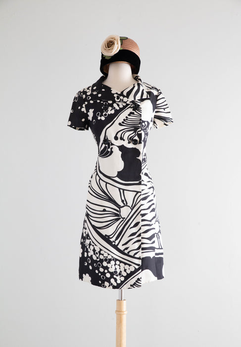 Absolutely fabulous 1960's bold swirling abstract print silk dress with short sleeves and hidden side pockets. Featuring a double breasted front with shiny black buttons. Fully lined interior. In excellent condition, freshly dry cleaned and ready to wear.