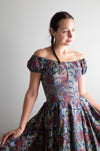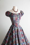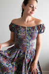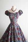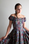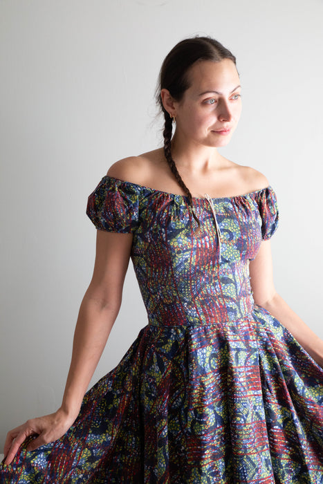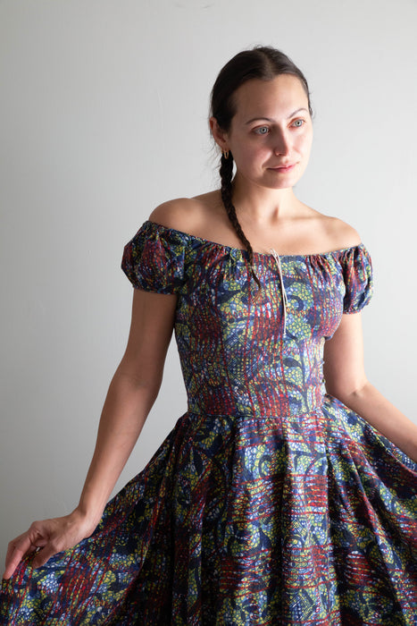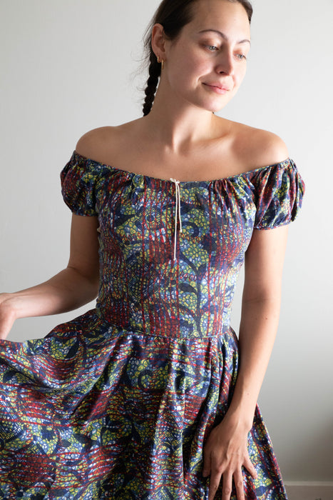 Iconic early 1950's cotton batik print dress by sought after designer Tina Leser. The perfect summer dress with seductive off the shoulder neckline. Featuring gathered puff sleeves, a fitted waist and full circle skirt. Zips up the back with original metal zipper. Freshly dry cleaned and ready to wear.