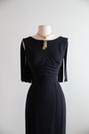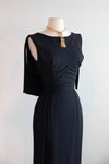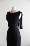 Absolutely fabulous late 1950's black silk crepe cocktail dress by high end label Edward Abbott for Wilson Folmar. This elegant sleeveless sheath features an expertly structured bodice with ruched sides and a slim fitting pencil skirt. What makes this dress a standout is the boldly articulated car wash fringe in the back. Guaranteed to turn heads! Zips up the back with original zipper and fully lined in silk. In excellent condition, freshly cleaned and ready to wear.