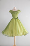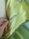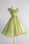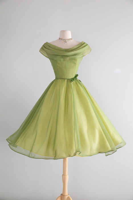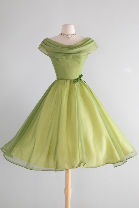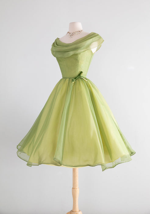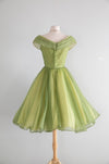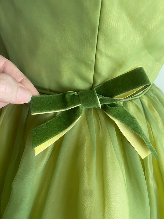 Step into a vintage fairytale in our 1950's party dress! This dress features a broad shawl collar, fitted waist, and a whimsical velvet bow. The yellow underlay and green organza top layer add a touch of two tone magic! The skirt is lined in a layer of crinoline for fullness. Zips up the back original metal zipper. In overall excellent condition, freshly dry cleaned and ready to wear.