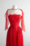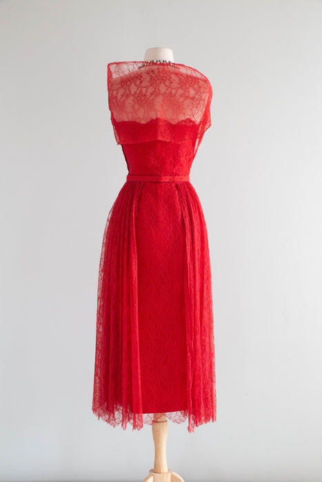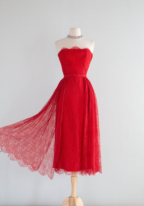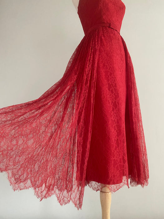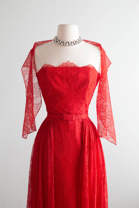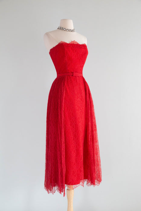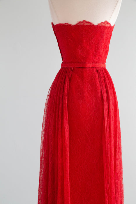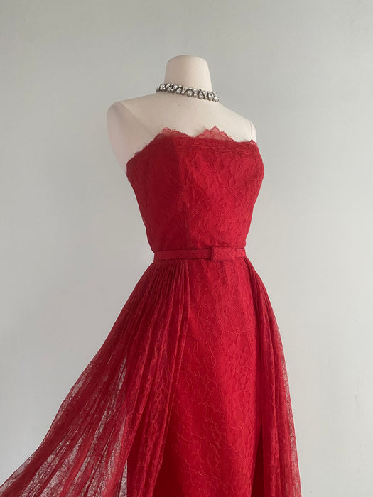 This Elegant 1950's Crimson Red Lace Strapless Evening Dress is a stunning choice for any formal event. Its fitted silhouette accentuates your figure, while the dramatic fly away lace panels add a touch of drama. The boned bodice provides support and structure, and the side zipper makes for easy wear. Fully lined for a luxurious feel. Comes complete with lace wrap and original belt. In excellent condition, freshly dry cleaned and ready to wear.