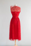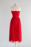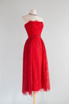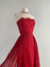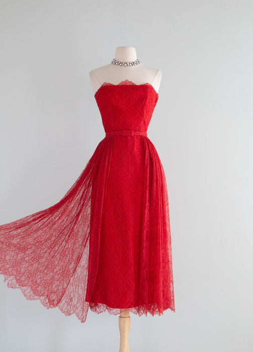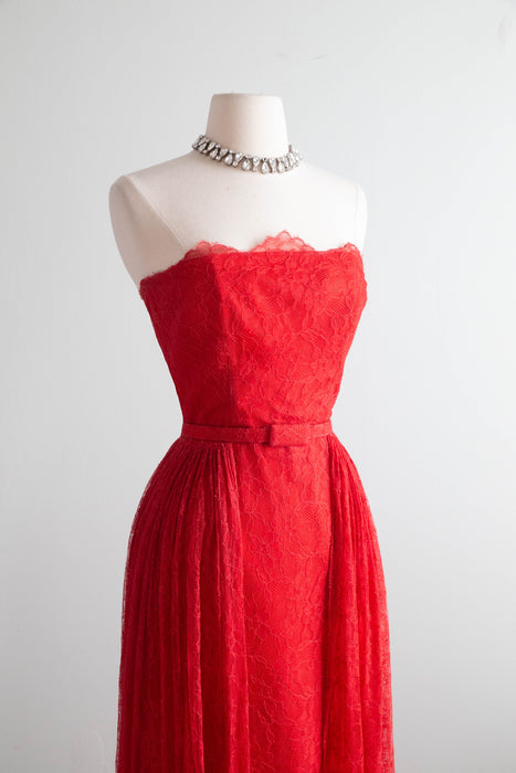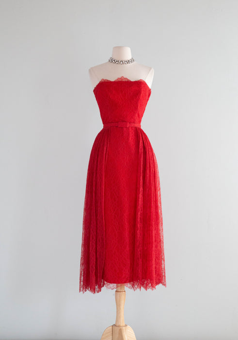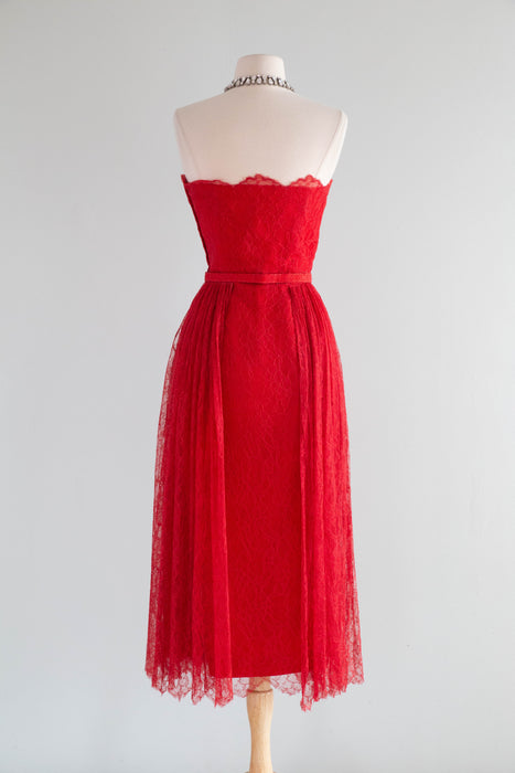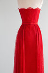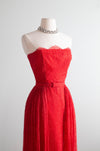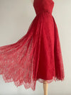 Elegant 1950's Crimson Red Lace Strapless Evening Dress / S