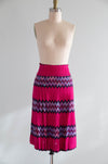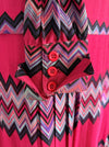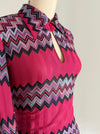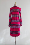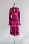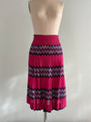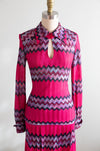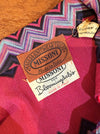 Make a statement in this rare 1970s Missoni two-piece set—an iconic example of the house’s legendary zig-zag maglia knit. Made in Italy exclusively for Bloomingdale’s, this vibrant ensemble features a sculpted long-sleeve top with a pointed collar and keyhole neckline paired with a softly pleated skirt that moves beautifully. The bold fuchsia, plum, lavender, and turquoise chevrons are classic early Missoni, created during the era when the family-run label was revolutionizing luxury knitwear. The woven “Maglia Knitwear – Tricot Missoni” tag dates the set to the brand’s most collectible years, while the Bloomingdale’s label reflects its early American exclusivity. In excellent condition, freshly dry cleaned and ready to wear.