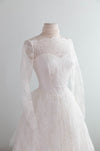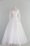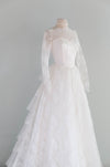 This exquisite 1950s lace wedding gown is a textbook example of mid-century bridal romance, balancing refined structure with ethereal softness. The bodice is masterfully tailored in delicate ivory lace, featuring a sheer illusion neckline that gracefully reveals a sweetheart under-bodice, a highly coveted detail of the era. Intricate floral and scroll lace motifs extend across the décolletage and into the long, slim lace sleeves, creating an effect that is both modest and undeniably feminine.