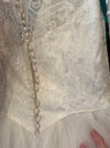The waist is precisely defined, flowing into a full, floor-length skirt that blooms into layers of lace and airy tulle. At the back, the gown reveals its most dramatic flourish: a pleated tulle train, tiered and softly cascading, lending movement and volume with every step. The rear closure is finished with a row of fabric-covered buttons, a hallmark of couture bridal craftsmanship from the period.