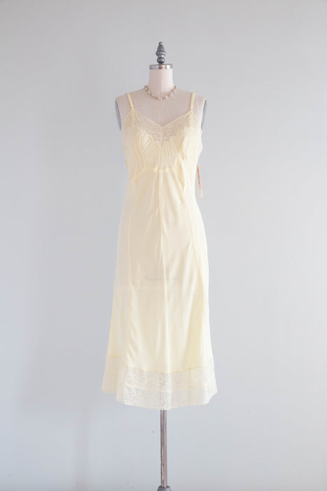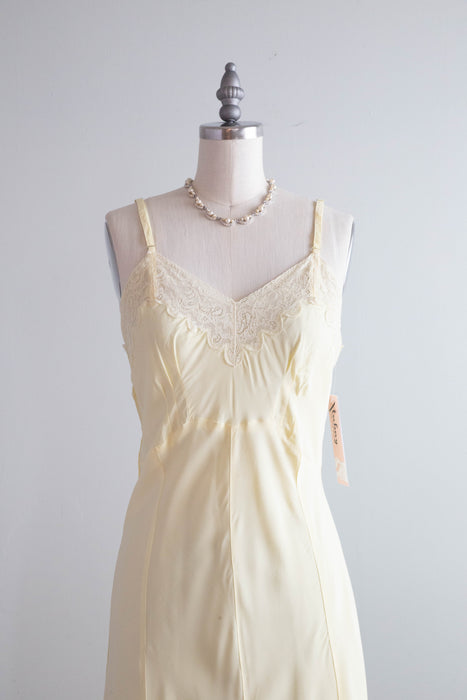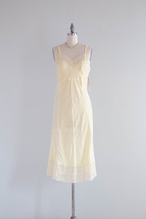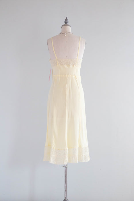 The prettiest 1940's soft butter yellow silky rayon slip with adjustable straps and lace trim. Appears to have never been worn. In excellent condition, freshly cleaned and ready to wear.