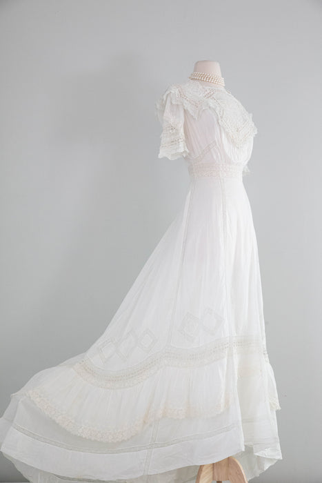 The dream wedding ensemble! Absolutely exquisite antique Edwardian wedding gown and matching slip from the 1900's. Composed of fine cotton batiste and featuring intricate lace insets and pin tuck pleats. Details of find hand tatted lace adorn the shoulders and sleeves. The skirt is tiered and forms a dramatic train in the back. Comes complete with original matching slip that is equally lovely as the gown itself. In excellent condition, no flaws to note. Freshly cleaned and ready to wear. One of the prettiest vintage Edwardian gowns I have seen.