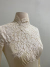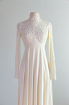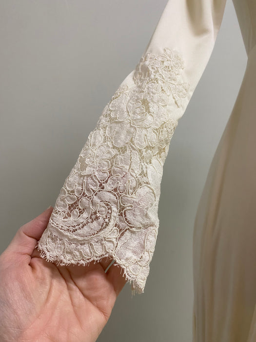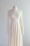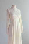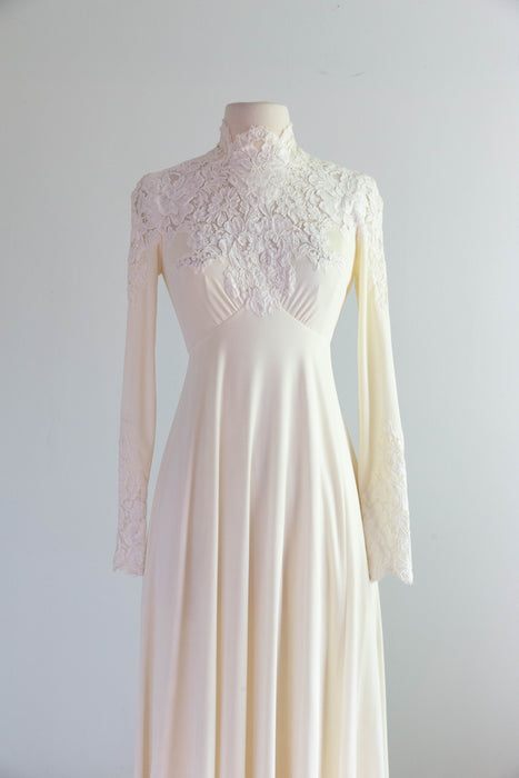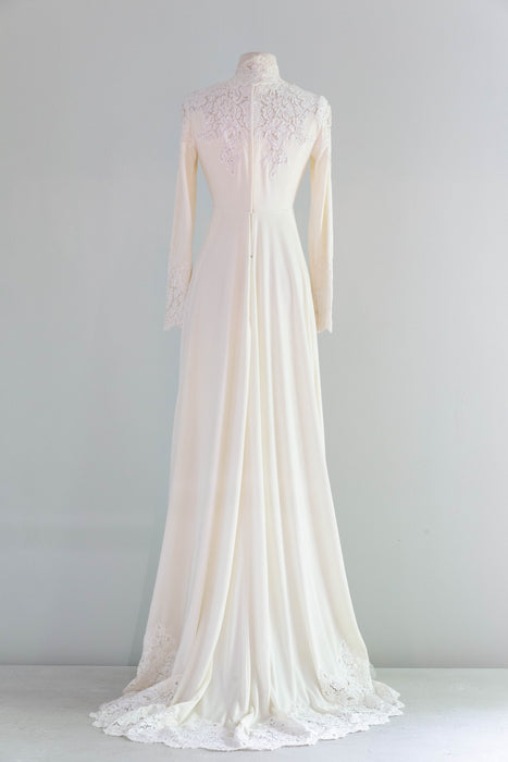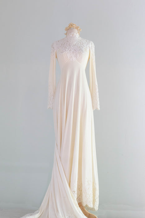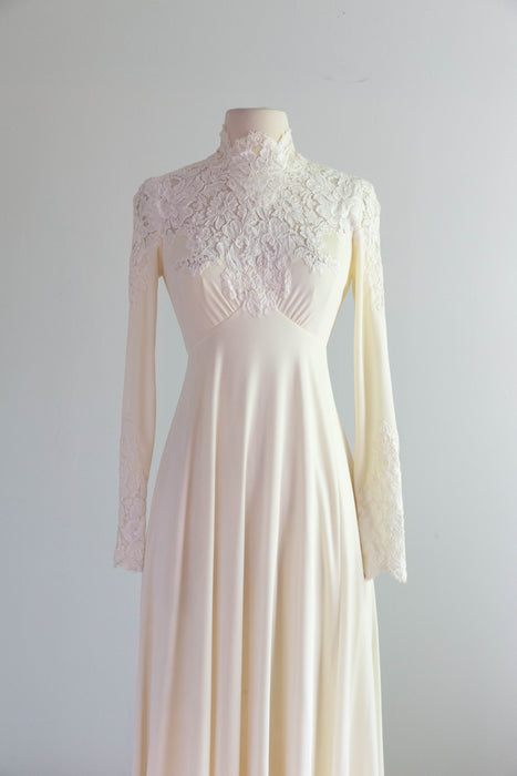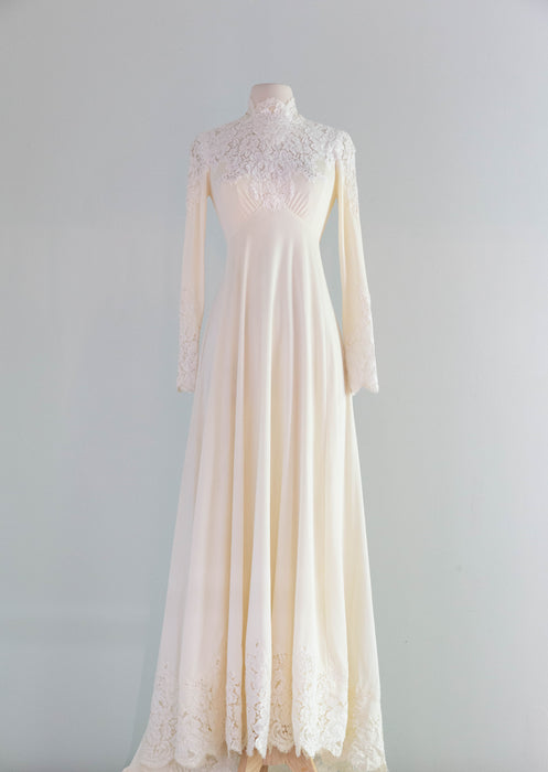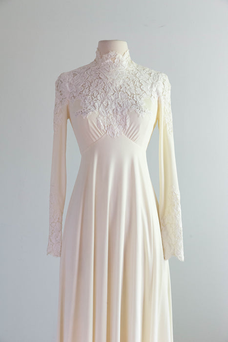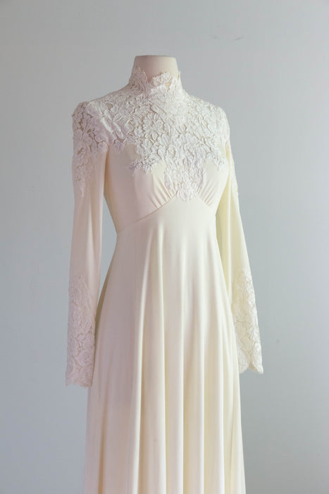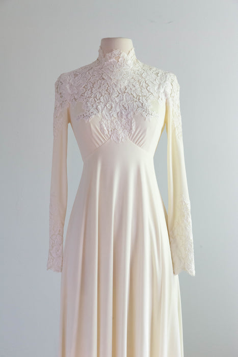 Romantic 1970's Edwardian Inspired Lace Trimmed Wedding Gown in Candlelight Ivory / SM