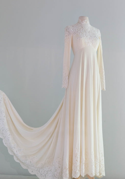 This stunning 1970's Edwardian inspired wedding gown in a soft candlelight ivory boasts a flattering silhouette and a beautiful train with scalloped lace trim. Adorned with delicate lace details, this gown is perfect for any bride looking for a touch of vintage elegance on their special day. Made of a high quality synthetic jersey and trimmed in cotton alencon lace. Fully lined interior. In excellent condition. Freshly cleaned and ready to wear.