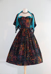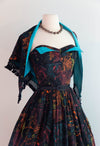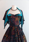 From my very own personal collection comes one of my all time favorite 1950's dresses by Sue Mason Jr. for Saba of California. Featuring the iconic Iliad fabric illustrated by artist Victor Malta in the style of Pablo Picasso for The Association of American Artists copyright 1953. Featuring a semi full gathered skirt, a boned strapless bodice with pronged turquoise rhinestones and peaked fold down bust lined in contrasting turquoise fabric. Comes complete with matching fringed shawl. A rare and coveted set in excellent condition. Zips up the back with original metal zipper. Freshly cleaned and ready to wear.