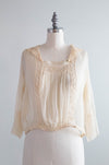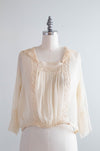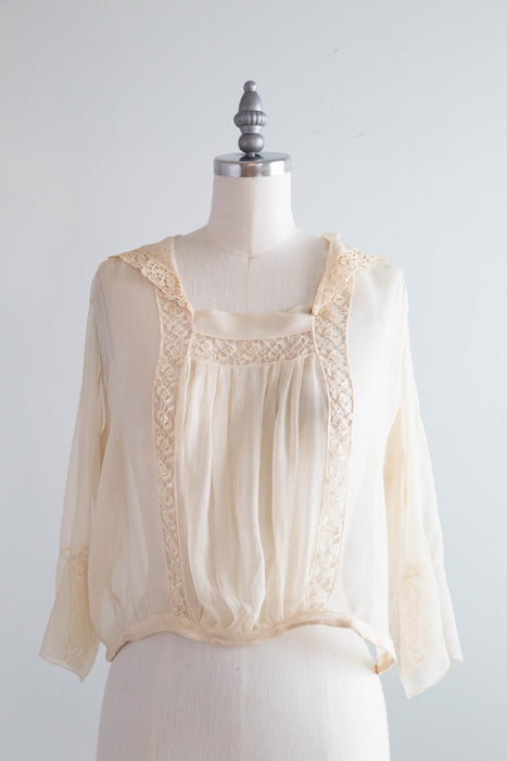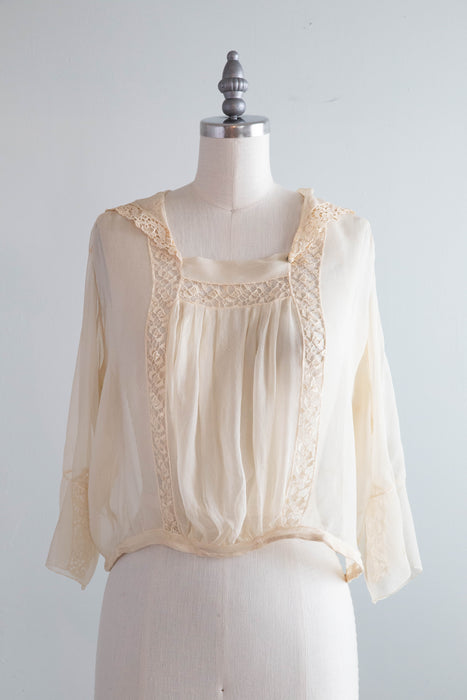 Delicate & ethereal silk chiffon blouse from the 1920's. Warm ivory silk with delicate cotton lace, a pleated front, sailor collar. Featuring the most beautiful sleeves. Snaps on the side for convenience.