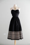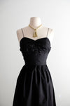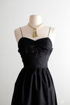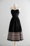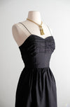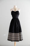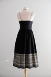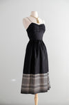 This exquisite 1950s black dress features intricate metallic gold embroidery along the hem of its black silk fabric. It showcases delicate thin straps, a sweetheart neckline, and subtle gathering at the bust. A metal zipper runs up the side for secure closure. Recently cleaned and prepared for immediate wear.