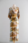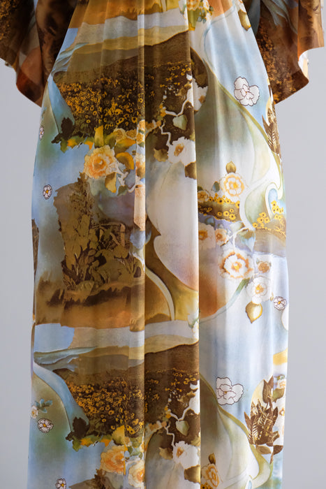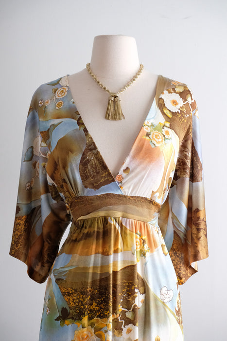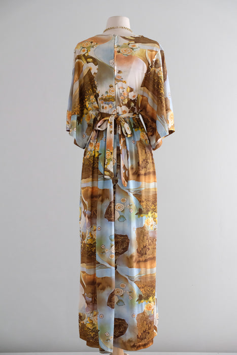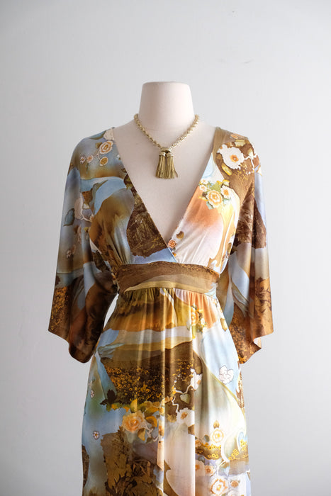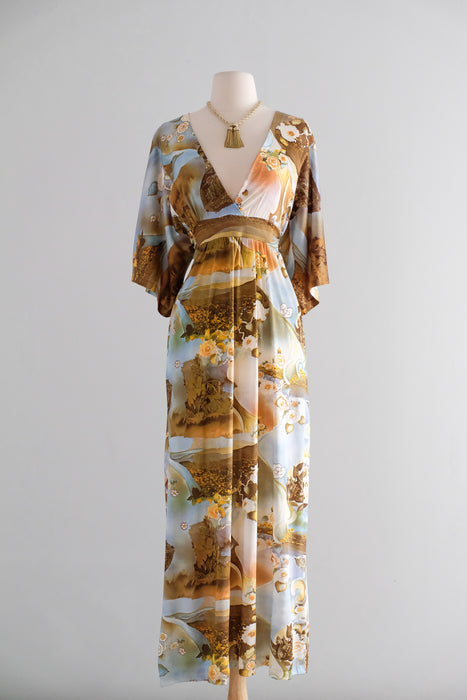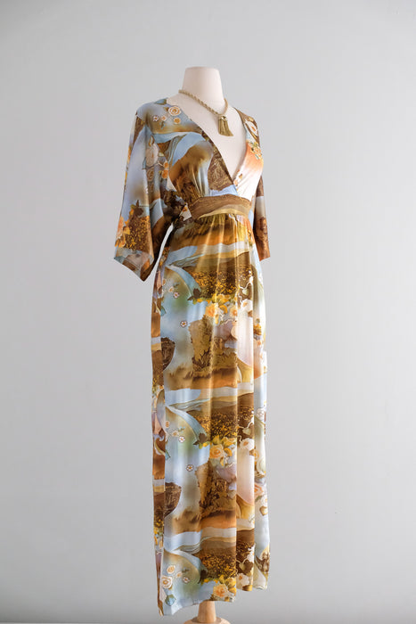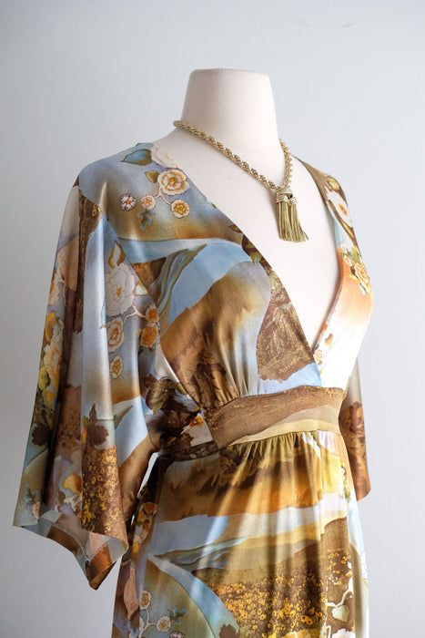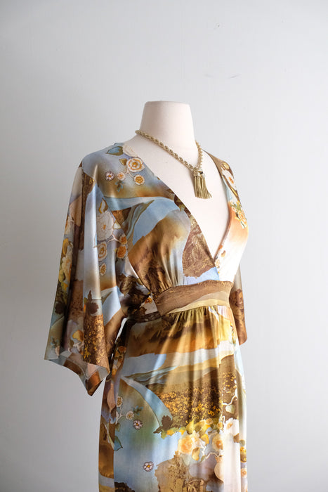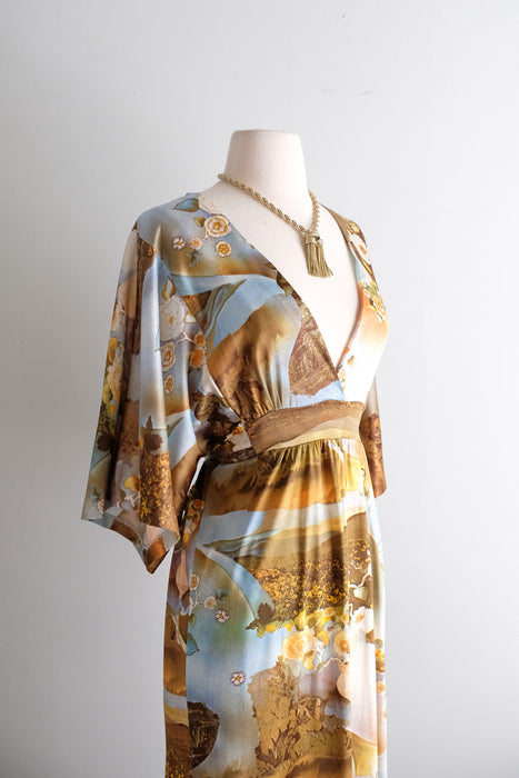 Dreamy 1970's photo printed nylon jersey gown. Hostess style full length dress with deep V neckline and wide 3/4 length sleeves. Amazing scenic floral photo collage print in shades of blue and yellow. Empire waist, ties in the back. Zips in the back. Freshly cleaned and ready to wear!