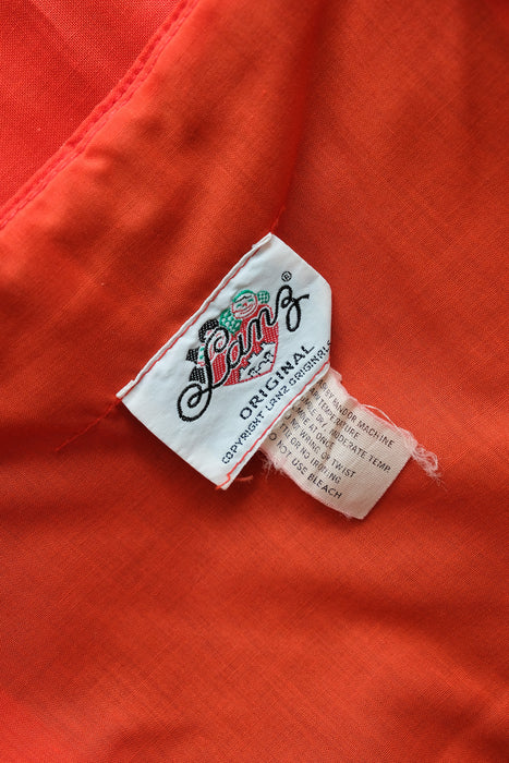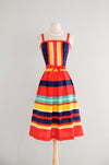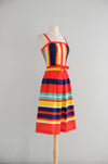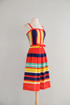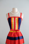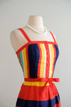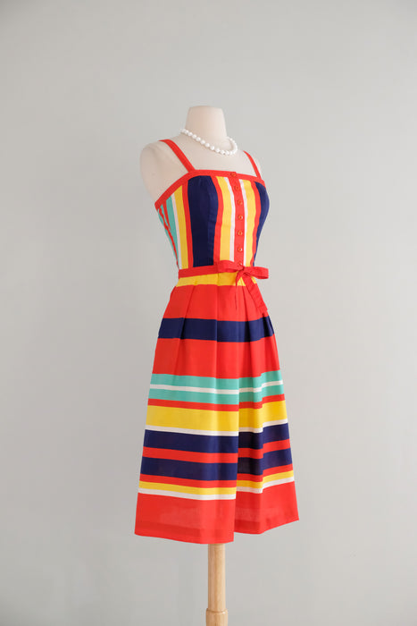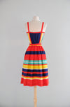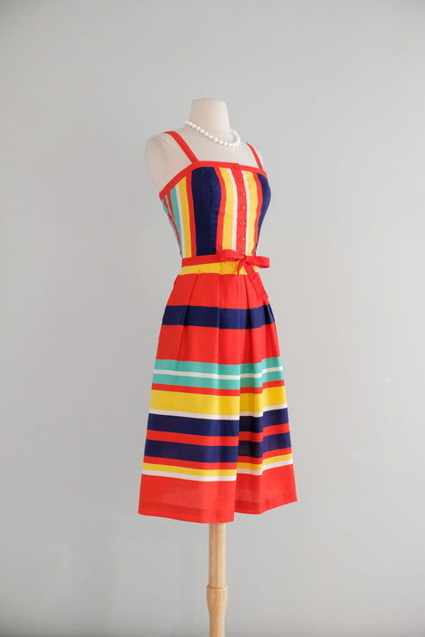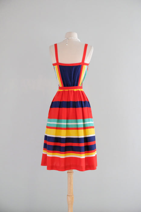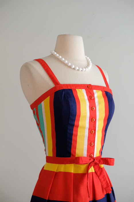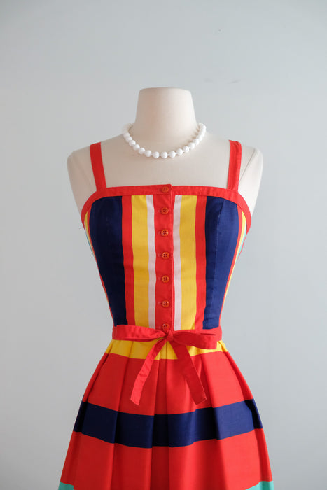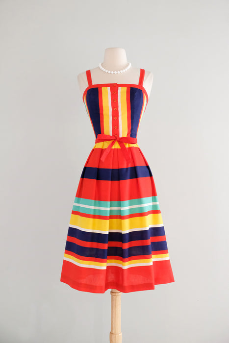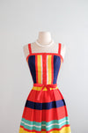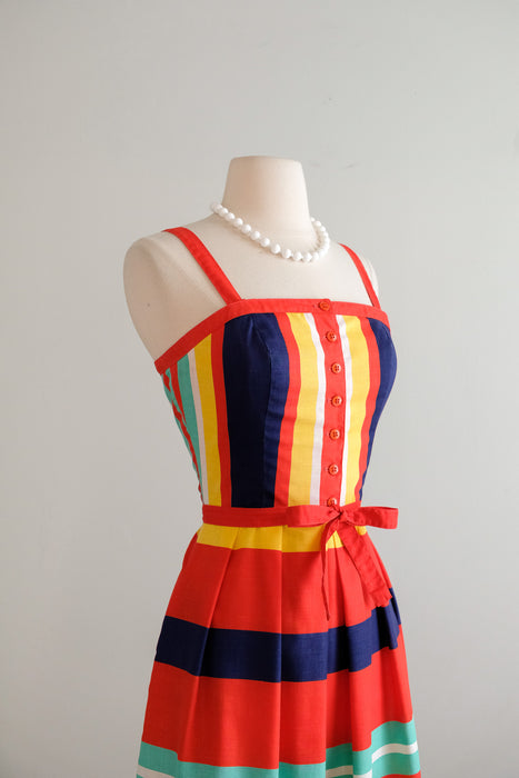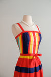 Amazing 1970’s bold color block cotton dress by Lanz. Fit and flare style dress in a red, yellow, navy, and turquoise striped cotton. Matching red waist tie and adorable red buttons in the front. Square neckline with tank straps. Freshly cleaned and ready to wear!
