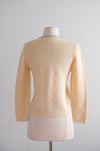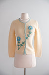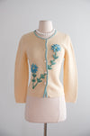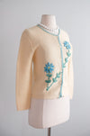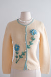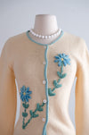 Adorable 1960's ivory and blue wool knit cardigan sweater by Bobbie Brooks. Darling blue daisy embroidery work across the front with matching blue trim. Ivory buttons in the front. Freshly cleaned and ready to wear!