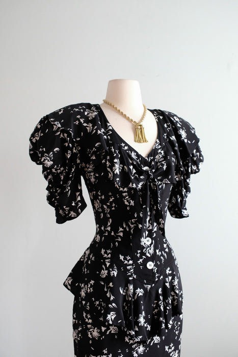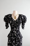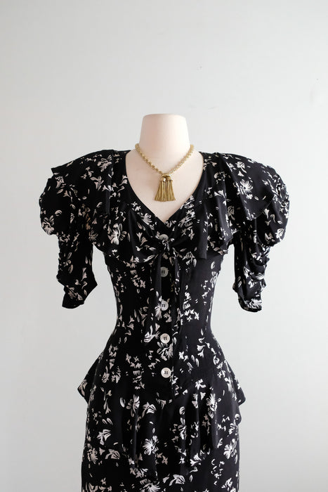Lovely late 1980's black & white floral printed rayon dress by Karen Alexander. 80' does 40's inspired dress with slim fitted silhouette and ruffled peplum details. Corset style seam work in the bodice, peplum at the waist that gathers down the back of the skirt. Peplum across the back and shoulders that ties in the front at the bust. White shell buttons in the front. Freshly cleaned and ready to wear!