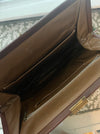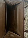 This impressive 1960s large structured needlepoint handbag showcases an intricate striped floral pattern on both sides. It features a wide single strap, a brass metal closure at the top, and brown leather trim. The interior is lined with brown vinyl and includes two pockets, all in excellent condition with no damage. The exterior leather shows some minor wear, visible in the photos.