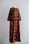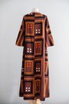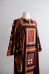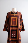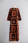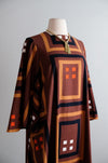 This exquisite 1970s Kaftan by Vanessa features a Marimekko-inspired mod block print, crafted in Finland from a cotton-rayon blend. The full-length silhouette is highlighted by flared long sleeves and a striking palette of brown with accents of orange, black, and white. It includes a back zipper for a tailored fit. Professionally cleaned and prepared, this vintage piece is ready to enhance any wardrobe.