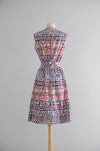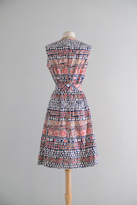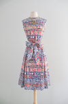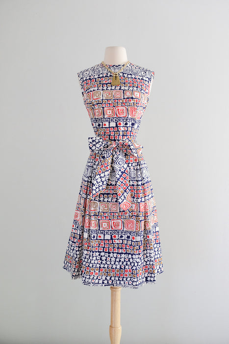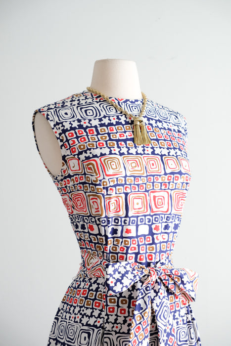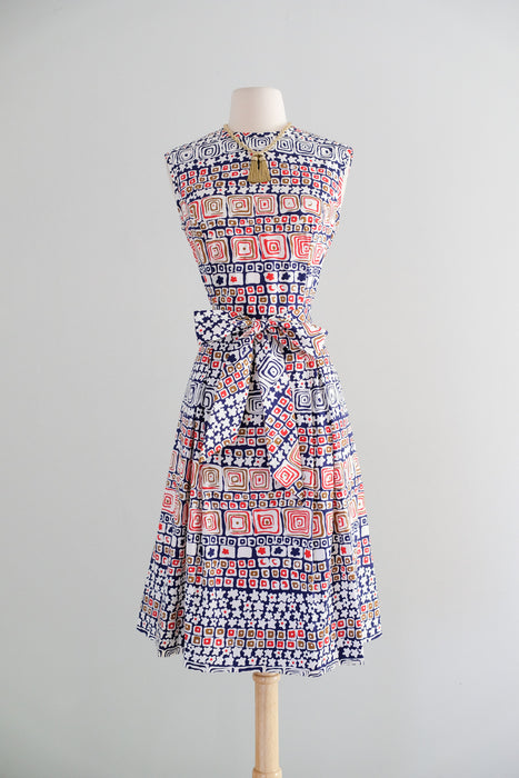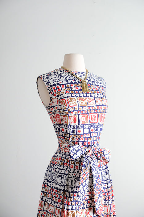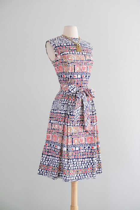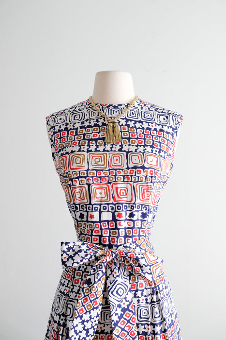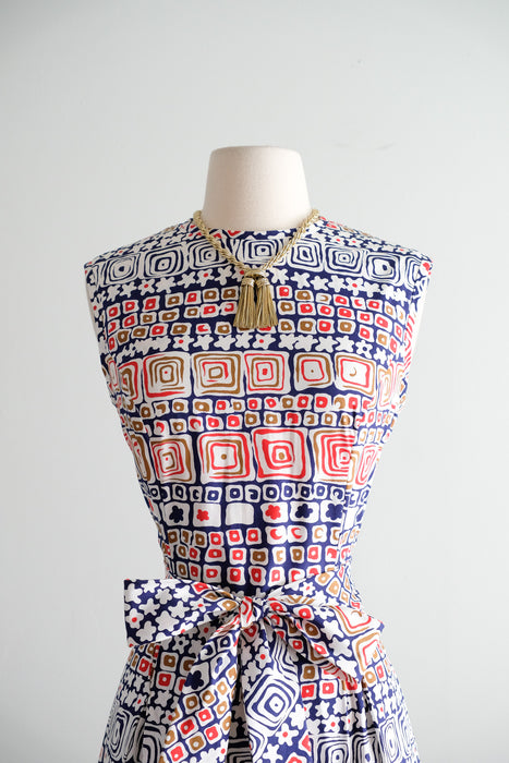 Coolest 1960's mod style shift dress by McMullens. Cotton fabric in brown red and navy with a unique batik style geometric print. Sleeveless dress with wide box pleating in the skirt. Matching waist tie. Zips in the back. Freshly cleaned and ready to wear!