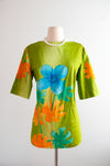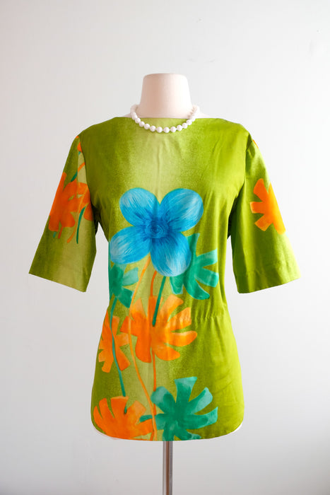 Incredible 1960's polished cotton Hawaiian shirt by Mannie Fineman for Playmaker. Stunning blue and orange abstract floral print, this blouse is like a wearable work on art. Rounded hem with small slits on each side. 1/2 sleeves. Button in the back. Freshly cleaned and ready to wear!