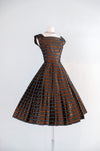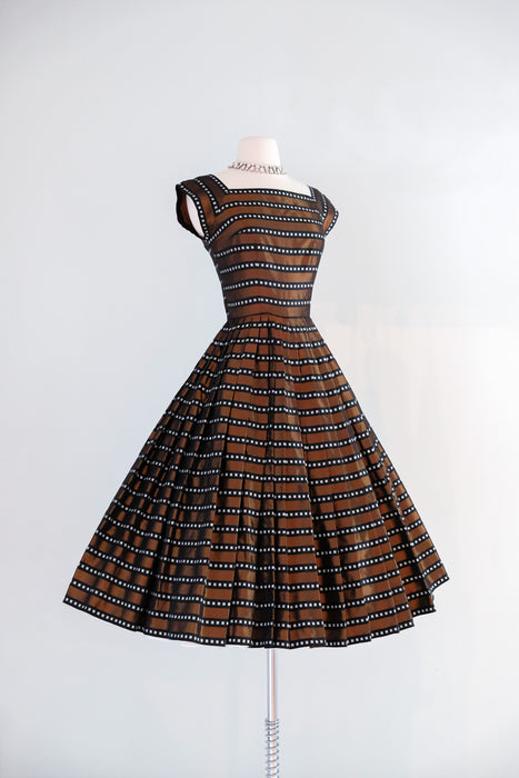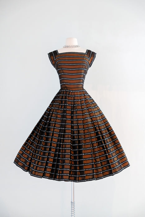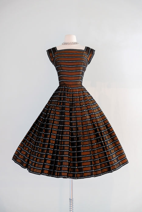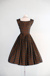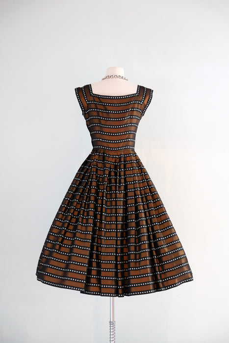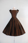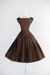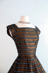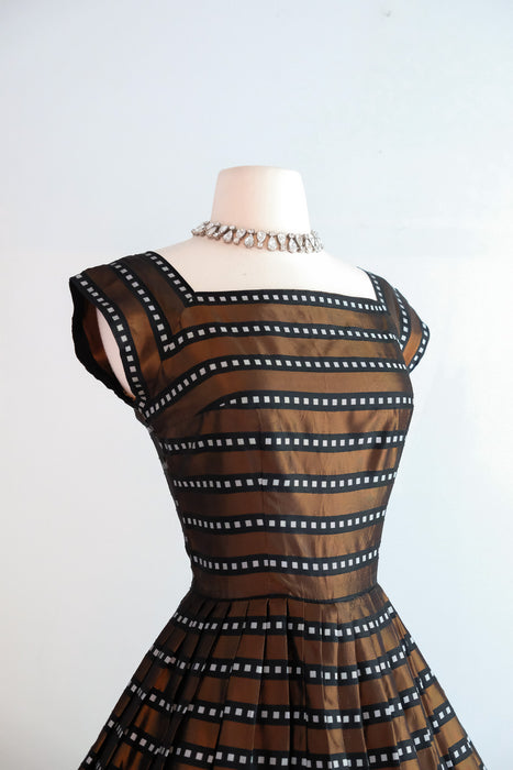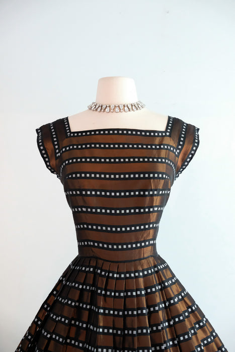 Luxurious 1950's striped copper dress. This stunning dress features a dazzling geometric pattern of alternating black and copper stripes, with delicate white boxes nestled within the black stripes. Its square neckline and cap sleeves exude elegance, while the fit and flare style accentuates your figure and includes an interior band that clasps at the waist and holds the shape. The fully pleated skirt adds a touch of refinement, and a metal zipper on the side of the waist ensures a perfect fit. Expertly cleaned and ready to be worn!