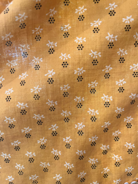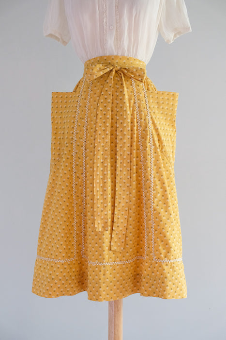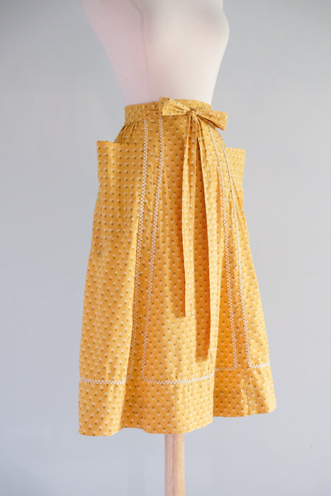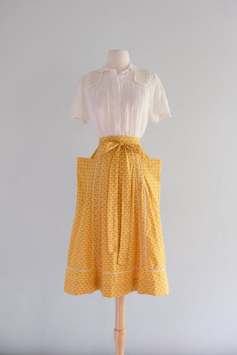 Sweet 1940's yellow and white cotton apron style skirt. Lovely shade of saffron yellow with ivory and charcoal grey floral print. Two large front pockets at the hips with ric rak ribbon trim. Wraps around the waist and ties in the front. Freshly cleaned and ready to wear!