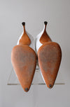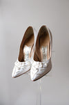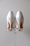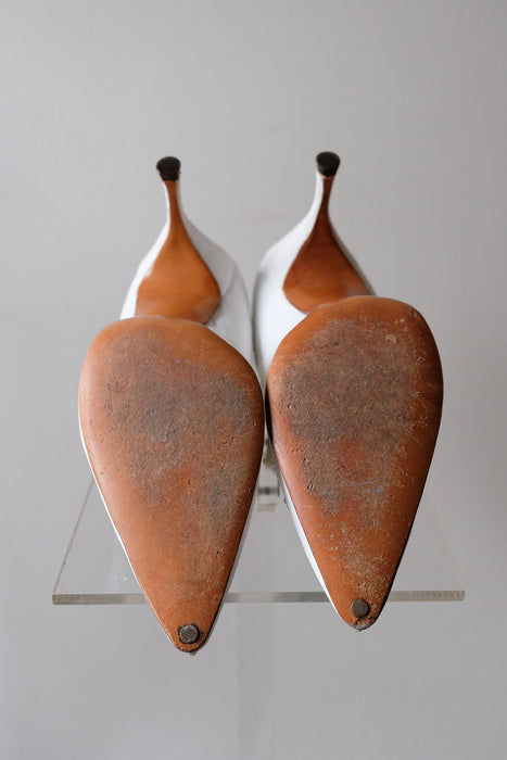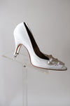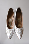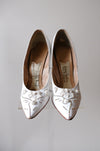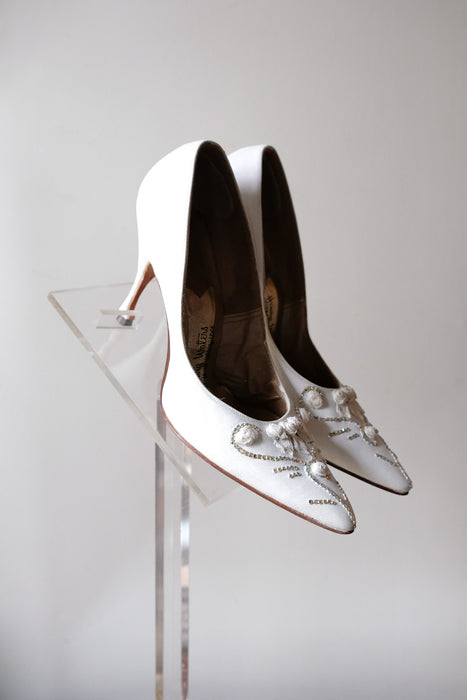 These came to use from the iconic Portland shoe designers own granddaughter and we are so excited to be able to share her fabulous collection! These white pointed toe pumps are fabulous with aurora rhinestones and rose buds embellishing the toes. Visible wear on the soles, see photos. Narrow fit.