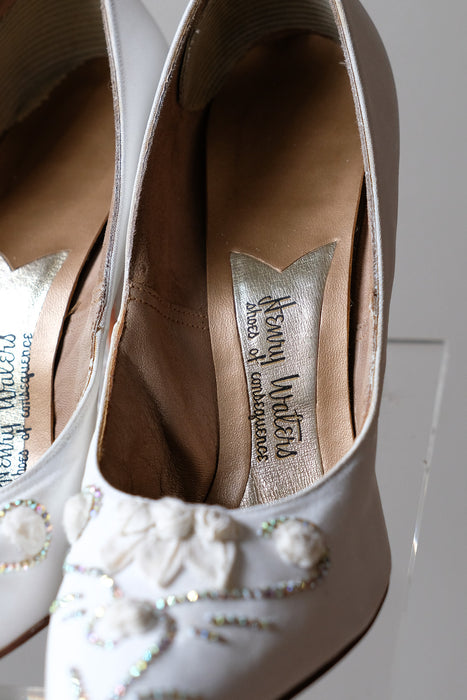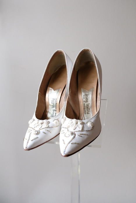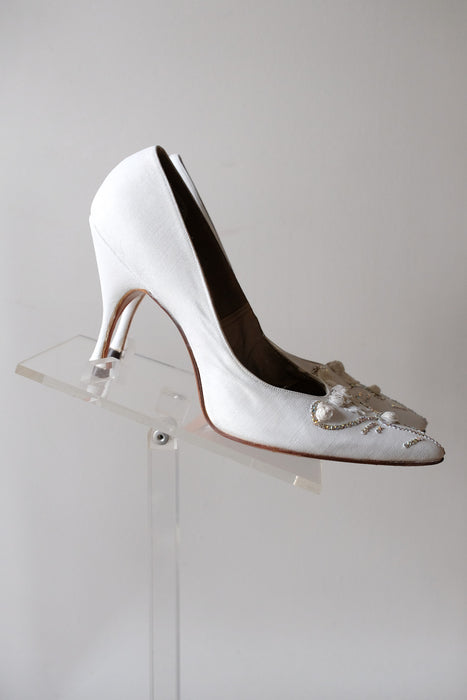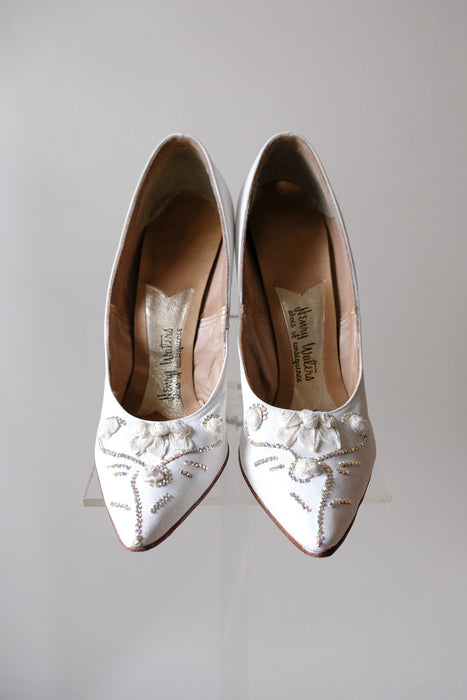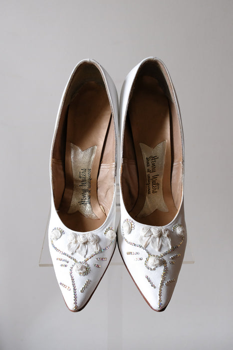 Vintage 1950's White Roses & Rhinestones Pumps by Henry Waters / Sz 8.5