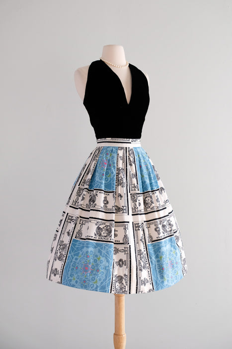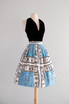 Coolest 1950's novelty print skirt with a charming dollar bill print. Large black and white one dollar bills surrounding a blue and pink floral mandala print. Fitted at the waist pleated full skirt. Metal zipper and button at the side of the waist. Freshly cleaned and ready to wear!