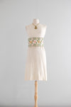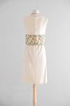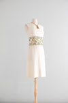 Sweet 1960's ivory and gold floral shift dress by Minx Modes. Ivory wool jersey knit material with pink and gold brocade floral design around the waist. Sleeveless shift style dress that is designed to look like a two piece. Lined interior with attached top that buttons in the back and zips underneath. Freshly cleaned and ready to wear!