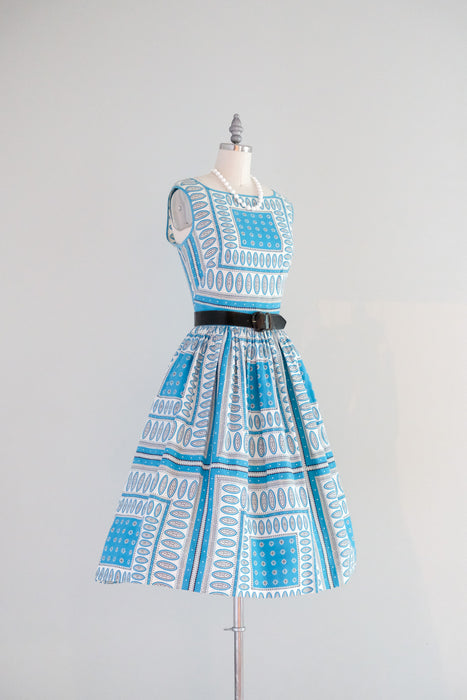Charming 1950's turquoise bandana style cotton novelty print dress. Fit and flare style sleeveless dress. Super fun astro style bandana print. Full skirt with pleating at the waist. In excellent condition, Metal zipper up the side. Freshly cleaned and ready to wear! Belt not included, used for styling purposes only.
