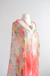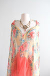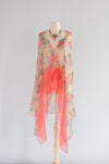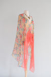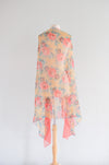 Whimsical 1920's spring floral chiffon garden shawl. Yellow, coral and blue floral rose printed sheer chiffon. Coral pink panels on each side. Super delicate garden party shawl. In excellent condition, clean and ready to wear!