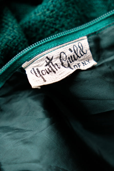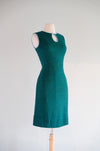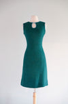 Stylish 1960's deep teal textured cotton twill shift dress. Gorgeous emerald teal color, with leather contrast detail along the collar and shoulders. Fully lined interior. Key hole cut out at the neckline. Zips up the back. Freshly cleaned and ready to wear!