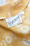This charming 1940's swing dress from Forget Me Not of Dayton Dress Co. shines in a lively marigold yellow and ivory floral cotton fabric. Featuring short sleeves and a classic vintage silhouette, it’s topped off with cute bow details on the shoulders and white buttons down the front. Recently cleaned and ready to brighten your wardrobe!