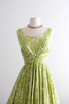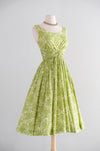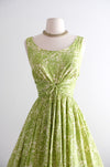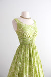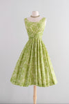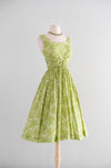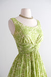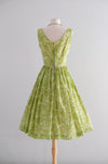 This stunning 1950's garden party dress features a sleeveless fit-and-flare silhouette crafted from exceptionally soft cotton. Scoop neckline and a tie detail that gathers at the center of the waist. The soft chartreuse green background is adorned with a delicate pear green rose floral pattern. Finished with a metal zipper at the back. In excellent condition, freshly cleaned and ready to wear!