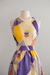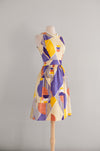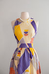 Charming 1960s cotton dress featuring a sleeveless, textured ivory fabric adorned with a purple, yellow, and coral abstract geometric pattern. Designed in a flattering fit-and-flare silhouette with a convenient front pocket on the skirt and a back zipper closure. Professionally cleaned and prepared for immediate wear.