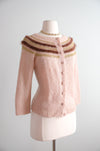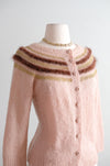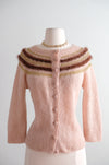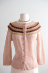 Step into retro charm with this delightful 1950s mohair cardigan in dreamy neopolitan pink. Hand-knitted from fuzzy mohair and angora, it features whimsical chocolate brown and gold lurex stripes dancing across the collar, and matching knit buttons. This freshly cleaned vintage treasure is ready to add a touch of mid-century sweetness to your wardrobe!